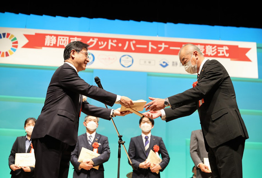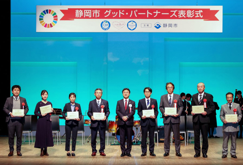 1月7日(金)しずぎんホールユーフォニアにて、「SDGs連携アワード」や「CSRパートナー企業表彰」などの表彰と合同で「静岡市 グッド・パートナーズ表彰式」が開催され、静岡市の田辺 信宏市長から29の企業や団体に表彰状が授与されました。