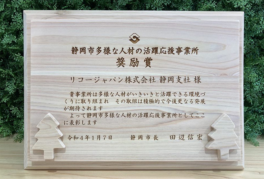 リコージャパン株式会社 静岡支社は、このたび静岡市の「多様な人材の活躍応援事業所表彰」の奨励賞を受賞したことをお知らせします。