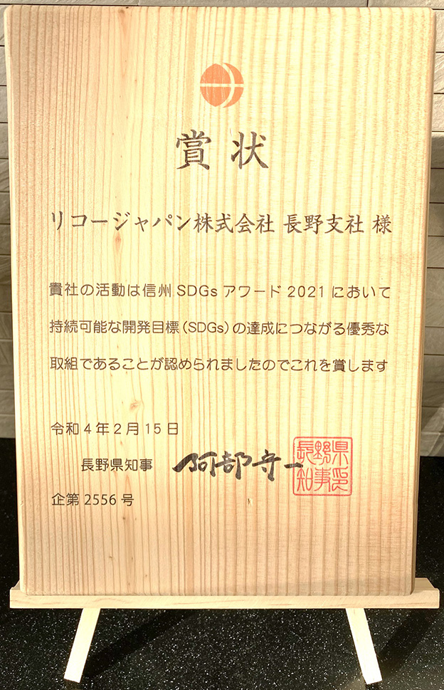 リコージャパン株式会社 長野支社は、このたび「信州SDGsアワード2021」長野県知事賞を受賞したことをお知らせいたします。