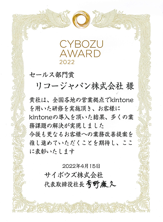 「CYBOZU AWARD」は2008年に新設された表彰制度で、リコージャパンは優秀賞など2013年度から10年連続で受賞しています。