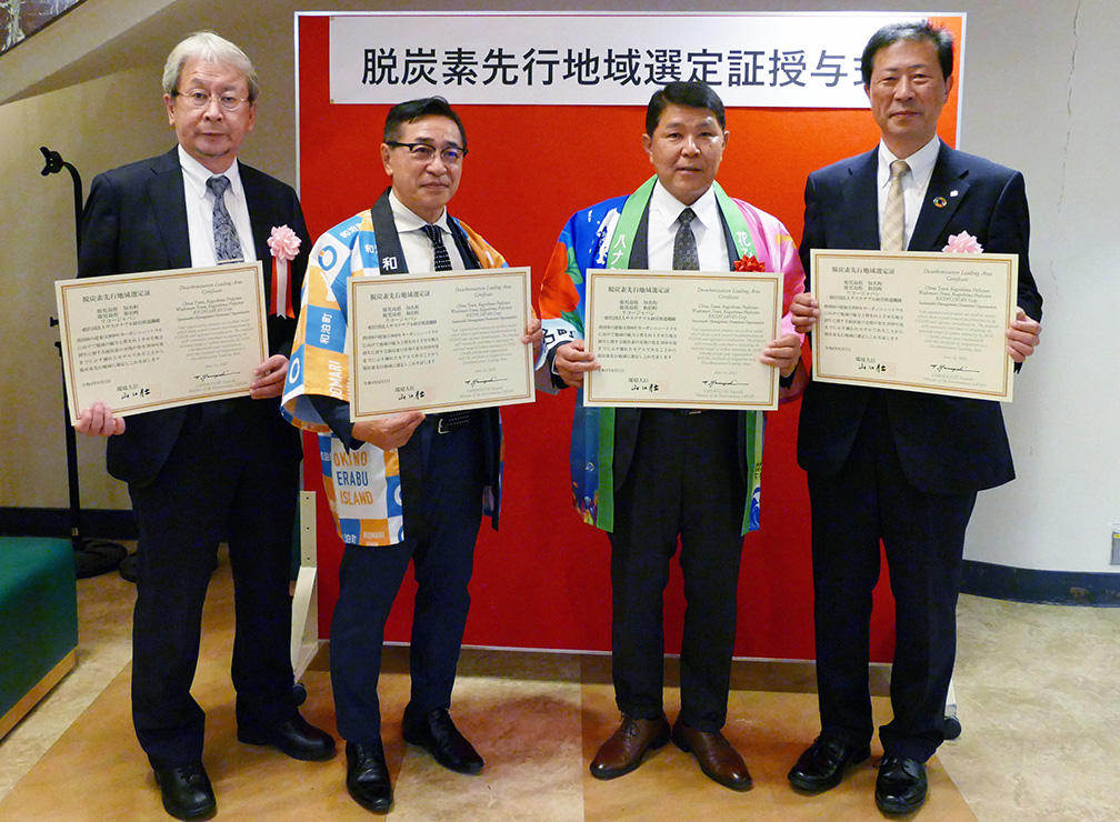 6月1日に第1回脱炭素先行地域選定証授与式が開催され、知名町長と和泊町長が山口 壯環境大臣から選定証を授与されました。