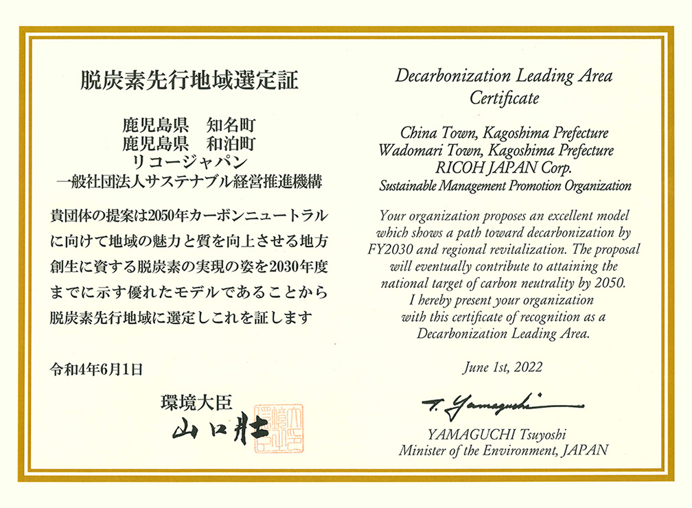 リコージャパン株式会社(社長執行役員:木村 和広)は、鹿児島県知名町(町長:今井 力夫)と和泊町(町長:前 登志朗)、一般社団法人サステナブル経営推進機構(理事長:石田 秀輝)と共に、「ゼロカーボンアイランドおきのえらぶ」を提案し、環境省の「脱炭素先行地域」*に選定されました。