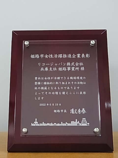 リコージャパン兵庫支社姫路事業所は、このたび兵庫県姫路市の「第4回姫路市女性活躍推進企業表彰」を受けたことをお知らせします。