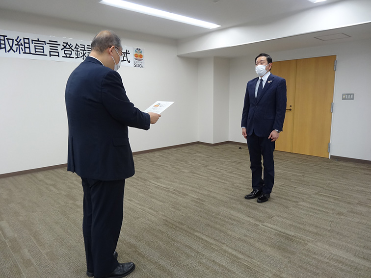 青森県企画政策部 東 直樹 部長(左)から登録証を授与される青森支社長 久米 善明(右)