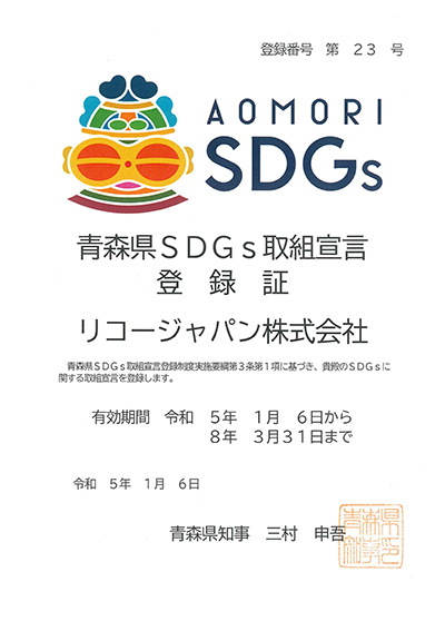 リコージャパン株式会社 青森支社は、このたび青森県の「青森県SDGs取組宣言登録事業者」に登録されたことをお知らせします。
