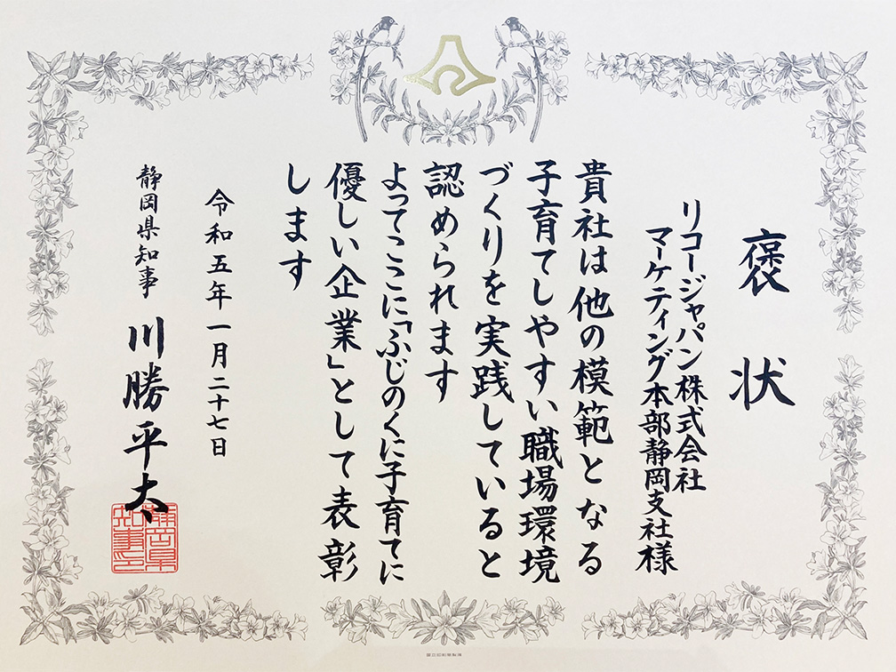 リコージャパン静岡支社は、このたび静岡県より令和4年度「ふじのくに子育てにやさしい企業」大規模企業部門に表彰されたことをお知らせします。