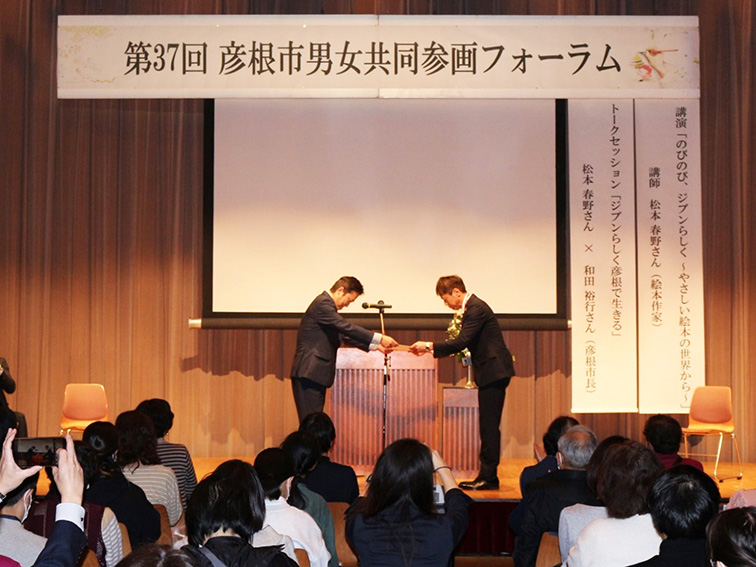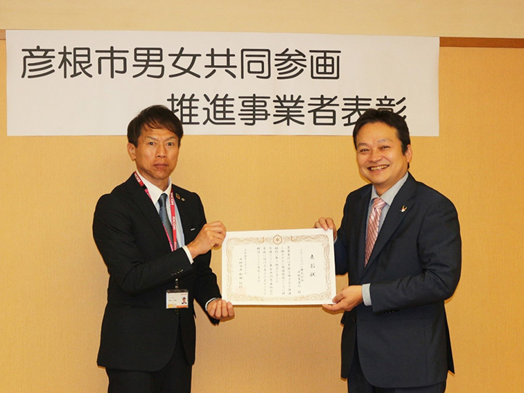 同市では、「男女共同参画を推進する彦根市条例」に基づき、家庭・地域・職場・その他の社会のあらゆる分野において、女性の能力活用や仕事と生活の両立支援など、男女が共同して参画することのできる環境づくりに積極的に取り組んでいる事業者を表彰し、市、市民、事業者等のパートナーシップによる取り組みを広げていくことを目的に、「彦根市男女共同参画推進事業者表彰」を実施しています。