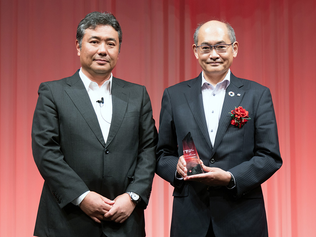 トレンドマイクロ 上席執行役員 コマーシャルビジネス統括 バイスプレジデント 新井 一人様(左)から、リコージャパン 取締役 宮本 裕嗣にトロフィーを授与