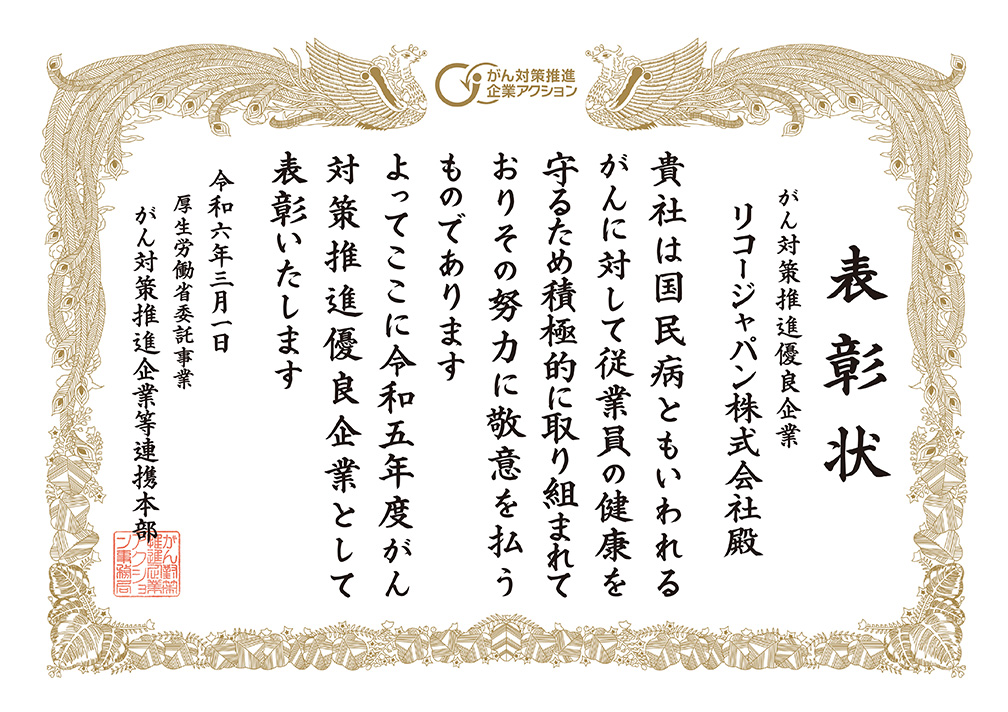 リコージャパン株式会社は、このたび厚生労働省委託事業「がん対策推進企業アクション」より、令和5年度の「がん対策推進優良企業」として表彰されたことをお知らせします。