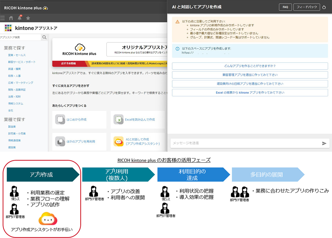 「アプリ作成アシスタント」は、AIとのチャットボット形式での会話を通じて、お客様が作成したいアプリを自動生成する支援機能です。「RICOH kintone plus」をご導入いただいた後、アプリ作成が思うようにいかずお困りのお客様を、AIがアシスタントとなってサポートします。