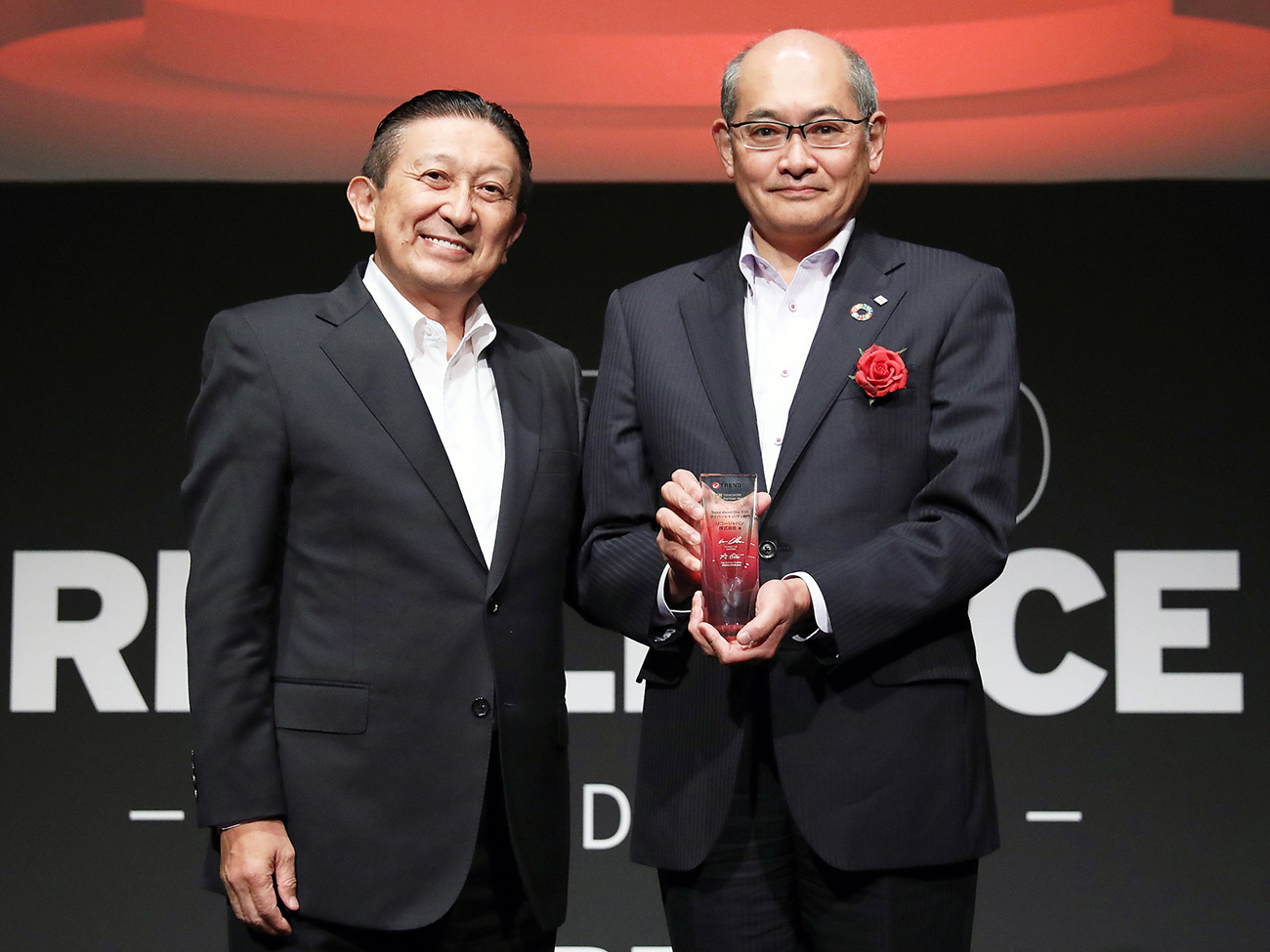 トレンドマイクロ 取締役副社長 大三川 彰彦様(左)から、リコージャパン 取締役 宮本 裕嗣にトロフィーを授与