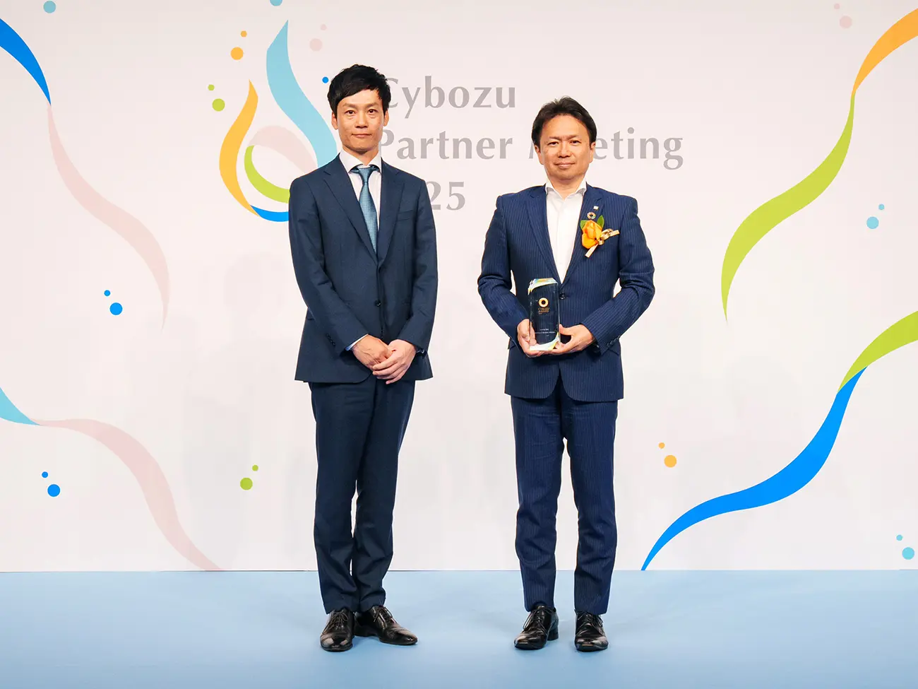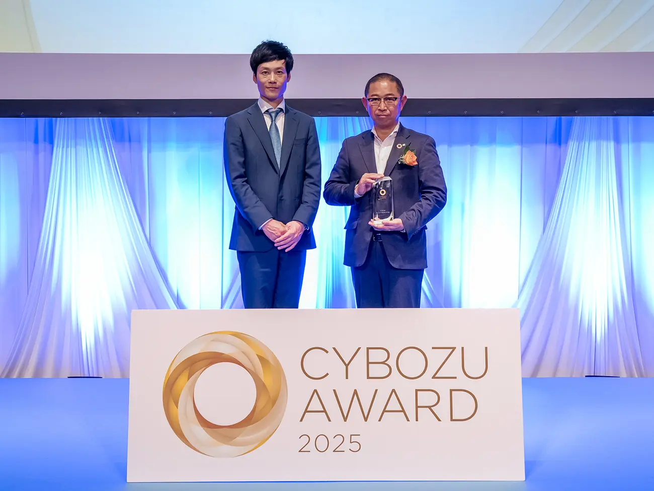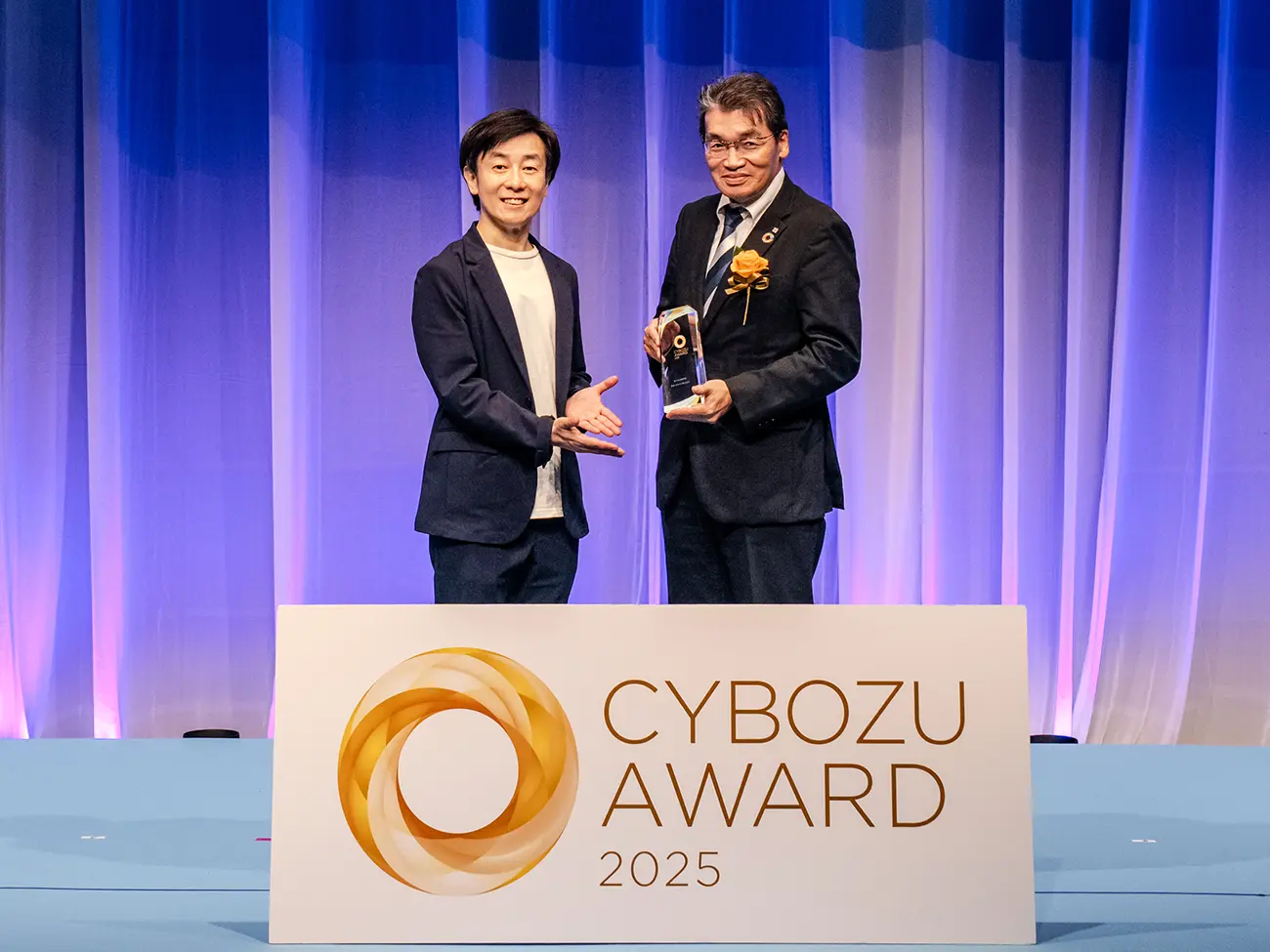 サイボウズ 青野 慶久 氏(左)より、セールス部門賞を授与される 執行役員 デジタルサービス企画本部 副本部長 服部 伸吾