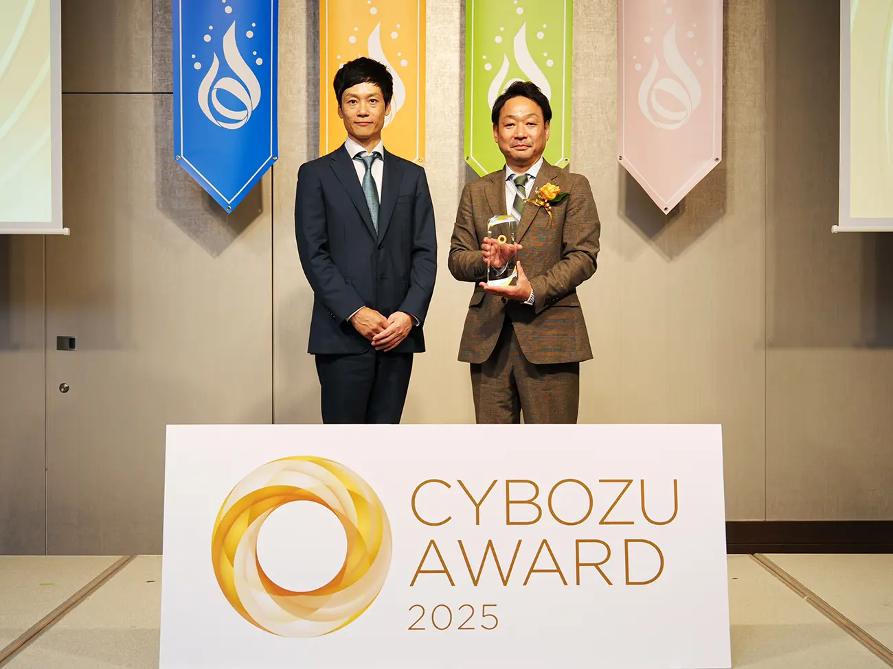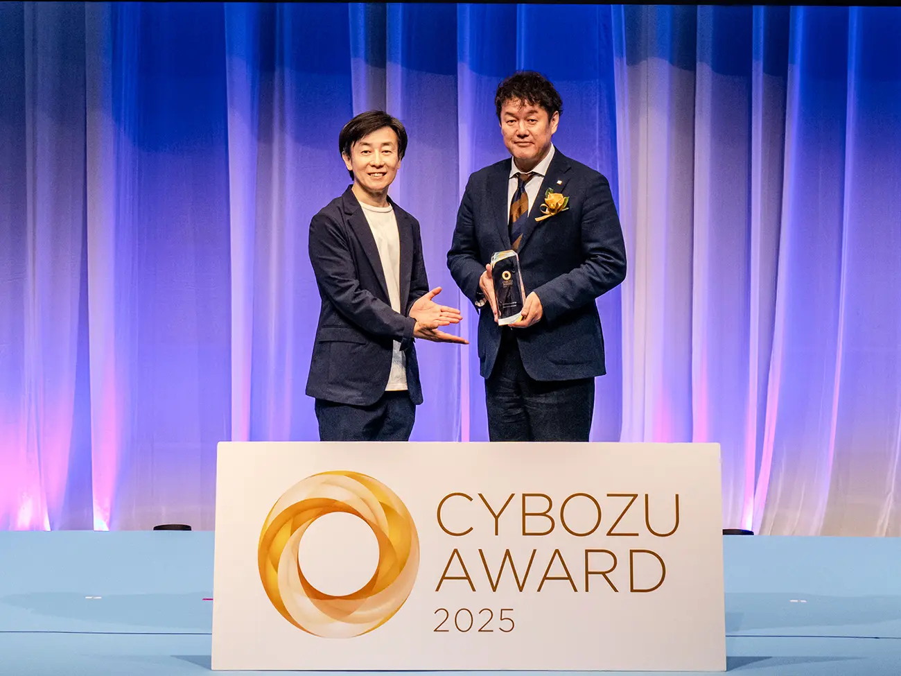サイボウズ 青野 慶久 氏(左)より、インテグレーション部門賞を授与される 執行役員 デジタルサービス技術本部 副本部長 栗原 拓也