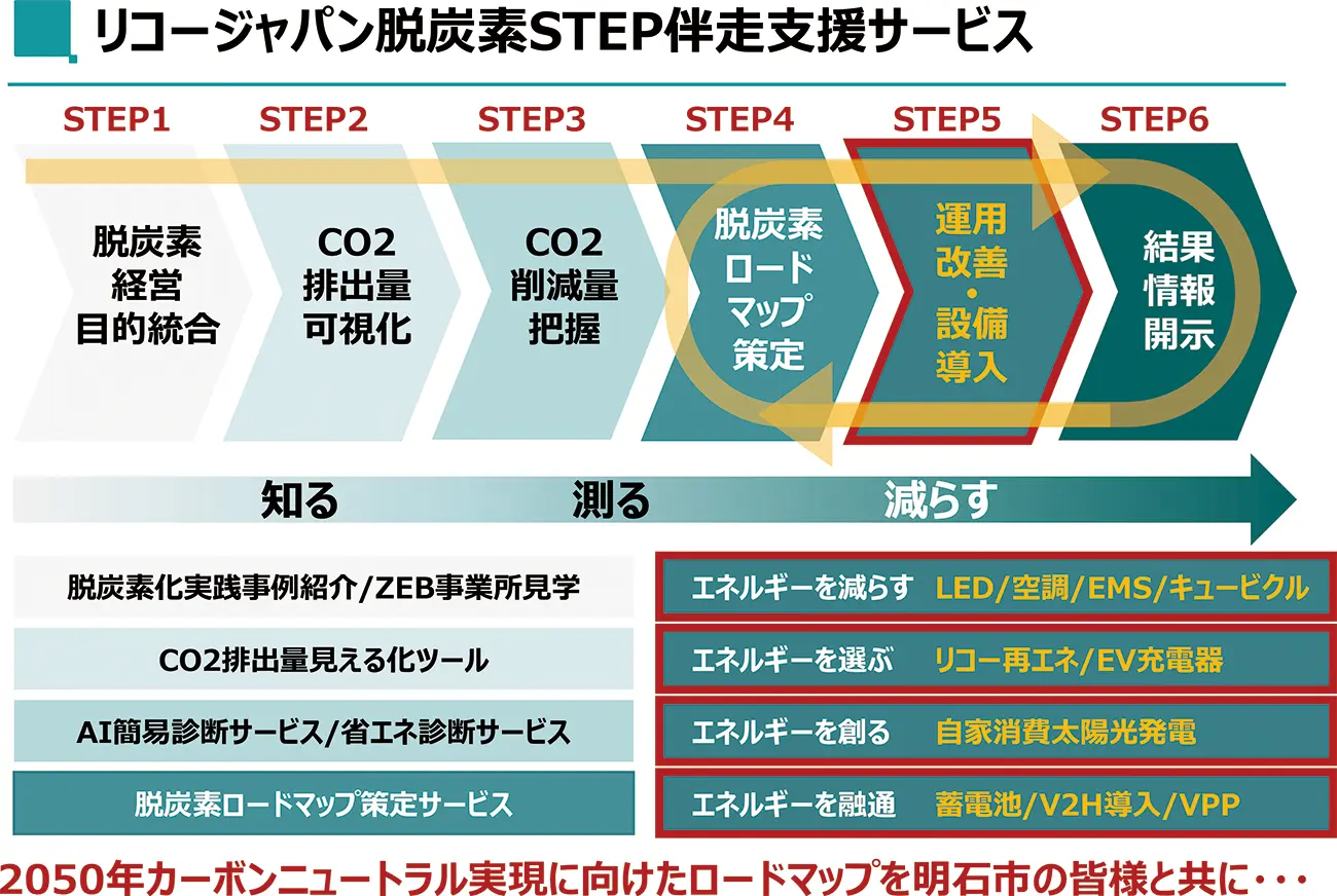 リコージャパンがこれまで培ってきた全国の企業や自治体への脱炭素に向けたステップ提案により蓄積したノウハウや実践事例をもとに、以下の3ステップを通じた市内事業者の脱炭素経営を伴走支援してまいります。