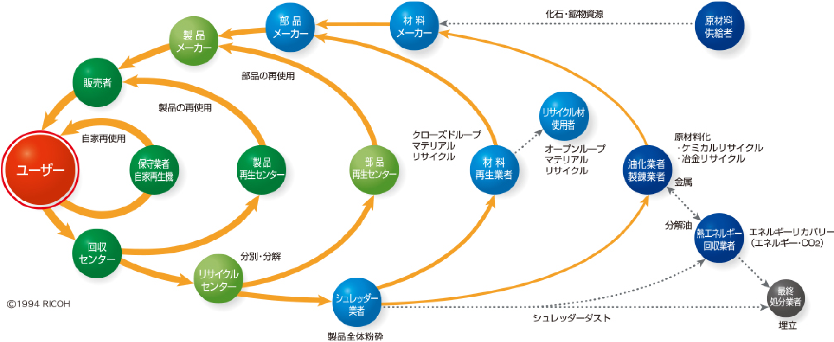 地球上の限りある資源を枯渇させず、将来に向けて持続可能な社会を創造していくためには、最小の資源やエネルギーで最大の効果を生み出すことのできる「循環型社会」の実現が求められます。リコーでは、製品を作る段階、お客様が製品やサービスを利用する段階、製品使用後という3つのステージのそれぞれで、資源を効率的に循環させるための取り組みを行ない、循環型社会の実現に貢献していきます。