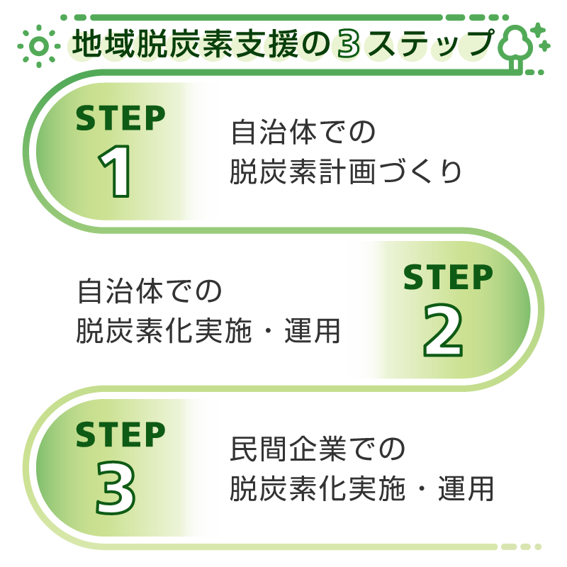 まず、脱炭素計画づくりのご支援では自治体の地域の脱炭素化の基本計画から補助金の申請、具体的手段の検討など協力させていだき、脱炭素化の初動を加速させます。