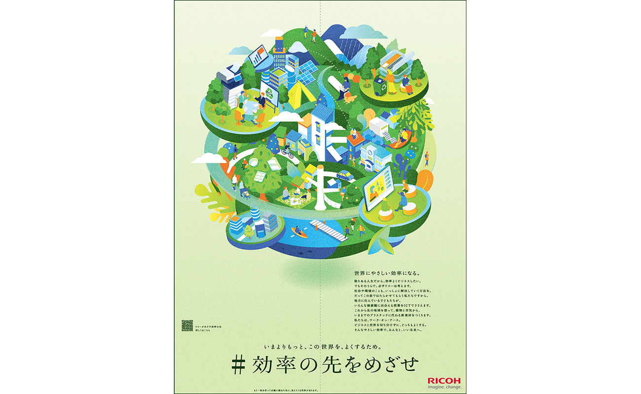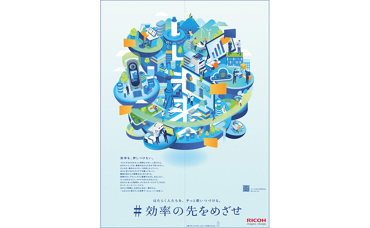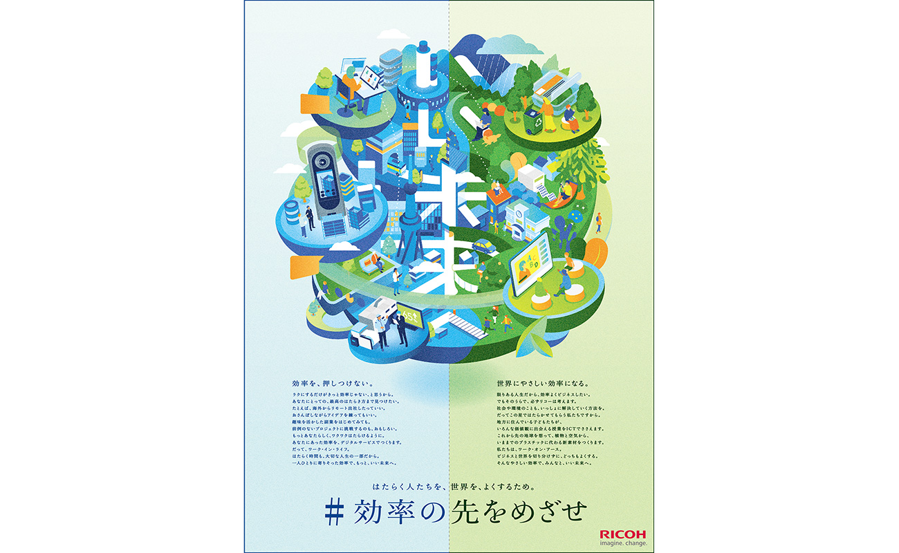 株式会社リコー(社長執行役員:大山 晃)は、昨年の「勤労感謝の日」に日本経済新聞朝刊において、「#効率の先をめざせ」というキャッチコピーとともに、ユニークなビジュアルで表現した「いい未来へ。」という15段(全面)広告を2面にわたり掲載しました。このたび本広告が、日本経済新聞社が主催する「第73回日経広告賞」において、「電機・通信・事務機・情報部門 優秀賞」を受賞しましたので、お知らせします。日経広告賞は、1952年から行われている歴史ある賞で、日本経済新聞紙上に掲載された広告の中で優れた作品を表彰するもので、全体表彰のほか、業種ごとに部門賞が設けられています。