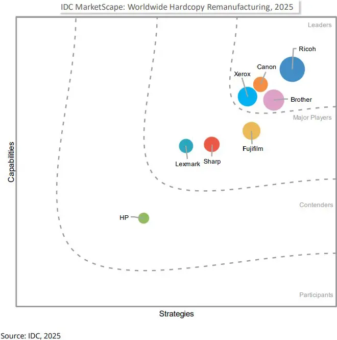 株式会社リコー(社長執行役員:大山 晃)は、米国のIT専門調査会社であるIDCが発行した複合機やプリンターなどの再生機器や消耗品に関する調査レポート「IDC MarketScape Worldwide Hardcopy Remanufacturing 2025 Vendor Assessment」において、世界的なリーダー企業として評価されました。