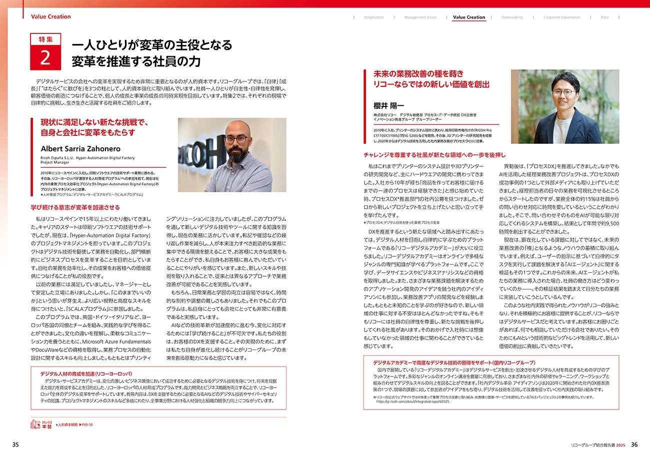 デジタルサービスの会社への変革に向けた各機能・事業戦略の説明に加え、その具体的な取り組みの進捗・成果として、お客様への価値提供事例と変革の主役となる人材の活躍事例を特集記事として紹介しています。