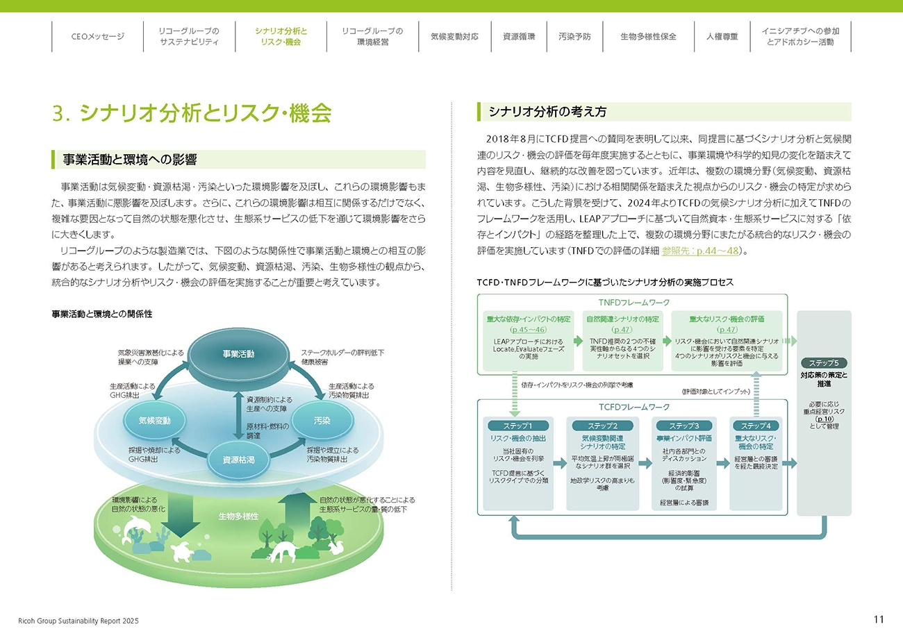 本年度より発行するリコーグループ サステナビリティレポートでは、環境および人権分野に関する情報開示の充実を図り、TCFD・TNFDなどの国際的な開示基準やフレームワークに沿った内容を掲載しています。