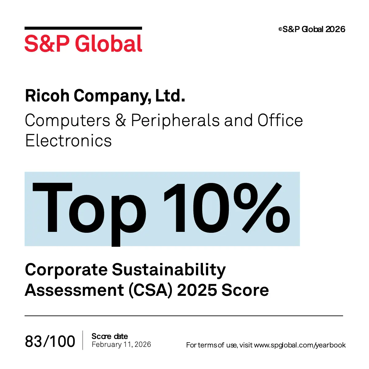 株式会社リコーは、世界的な調査・格付け会社である米国のS&Pグローバル社によるサステナビリティ格付けにおいて、上位10%のスコア*を獲得し、「Sustainability Yearbook 2026」のメンバーに選定されました。リコーは2019年以降、継続して「Sustainability Yearbook」のメンバーに選定されており、今回で8年連続の選定となります。