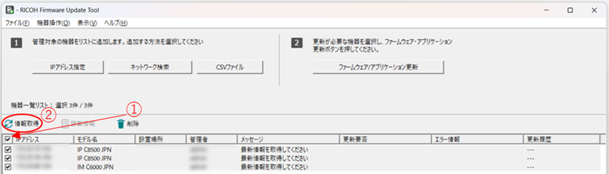①「RICOH Firmware Update Tool」で機器を全て選択(「IPアドレス」欄の左の枠に✓)してください。