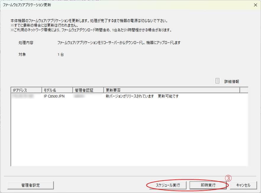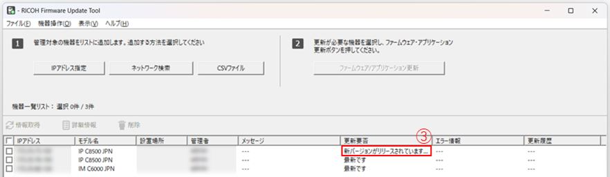 ③「更新要否」欄に「新バージョンがリリースされています」と表示されている機器があるか確認。