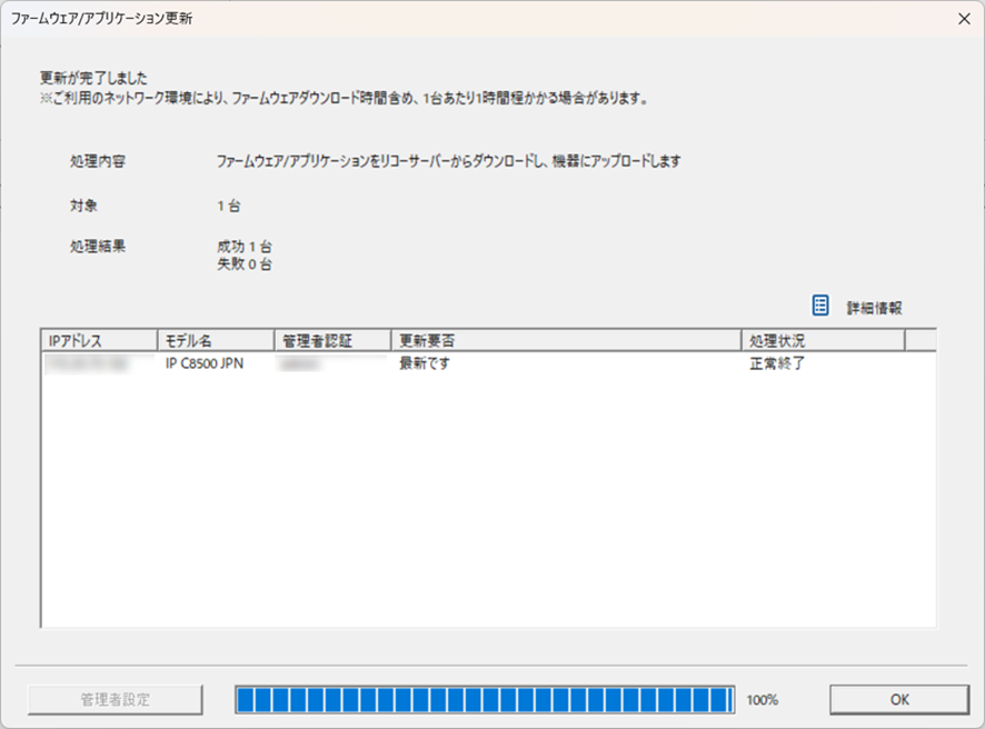 ⑤選択した機器の「更新要否」欄に「最新です」と表示されている事を確認してください。