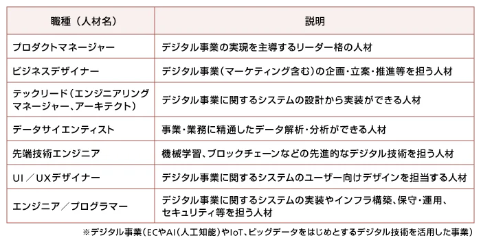DX人材は主に次の7つあげられます。この7つの人材像は、情報処理推進機構(IPA)が「デジタル事業に対応する人材」と定義しているものです。