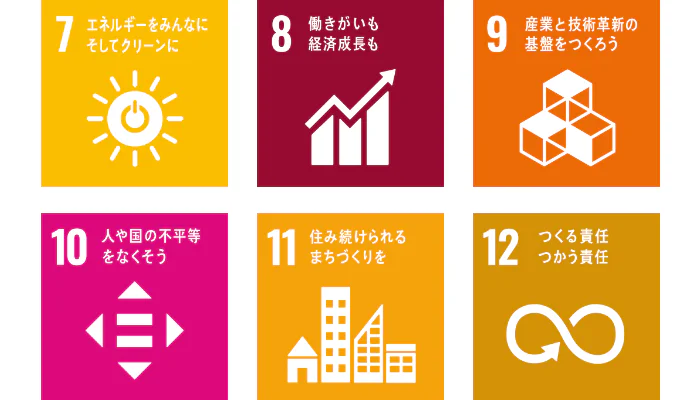 7〜12は、エネルギーや働きがい、産業基盤、まちづくりなど日本においても身近に感じる目標が定められています。
