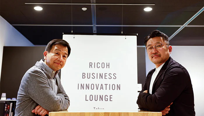パノラマティクス主宰・齋藤精一氏(右)と、リコーフューチャーズビジネスユニット プレジデントの入佐孝宏氏(左)。対談は、リコーの価値共創スペース「RICOH BUSINESS INNOVATION LOUNGE Tokyo」で実施した。