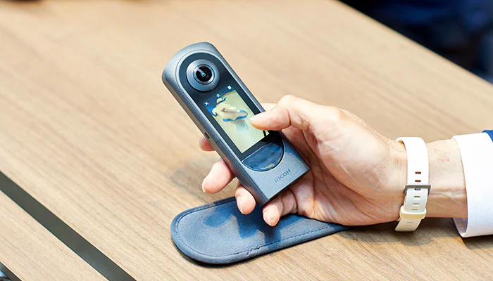 「THETA Xが目指したのは、ビジネスでの高い利便性です。これまでのモデルはスマートフォンとつなぐ必要があり、スマホとTHETAを持って撮影すると両手がふさがってしまうため、ビジネスシーンで使いにくいという課題がありました。THETA Xは液晶画面を搭載していて、設定・撮影から画像確認・データ保存までが1台で完結しますし、スマホと似た操作性で感覚的に使えます。11k(6,000万画素)に高めた静止画や本体での動的つなぎ処理で後処理の必要の無い動画撮影などの付加機能で、より簡便でリアルな360°画像や映像を撮影できるのが特徴です」。