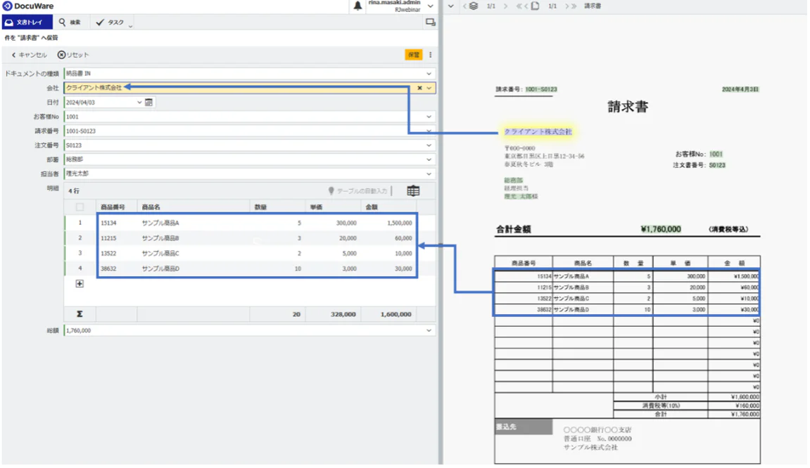 DocuWareのAI OCR「インテリジェントインデクシング」で入力された内容と原本を見比べられる