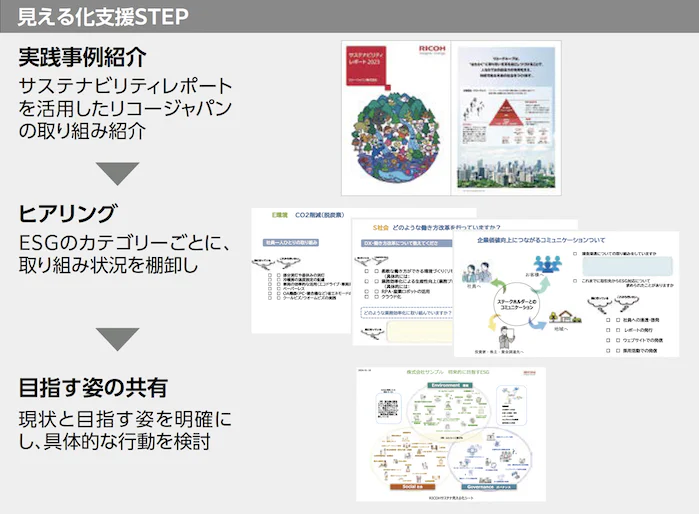 リコーは多種多様の業種や業務内容、企業規模、事業領域までデジタルサービスを提供して、企業のDXを後押ししてきた。ESGの取り組みについても、CO2削減や働き方改革、情報セキュリティなどお客様が抱える課題を解決する製品・サービスを提供することで、サステナビリティへの対応を支援している。さらに2023年からは、リコージャパンが独自で作成した「RICOHサステナ見える化ツール」を活用してお客様の取り組みや目指す姿をESGの観点からヒアリングして見える化し、優先順位を付ける活動を始めている。