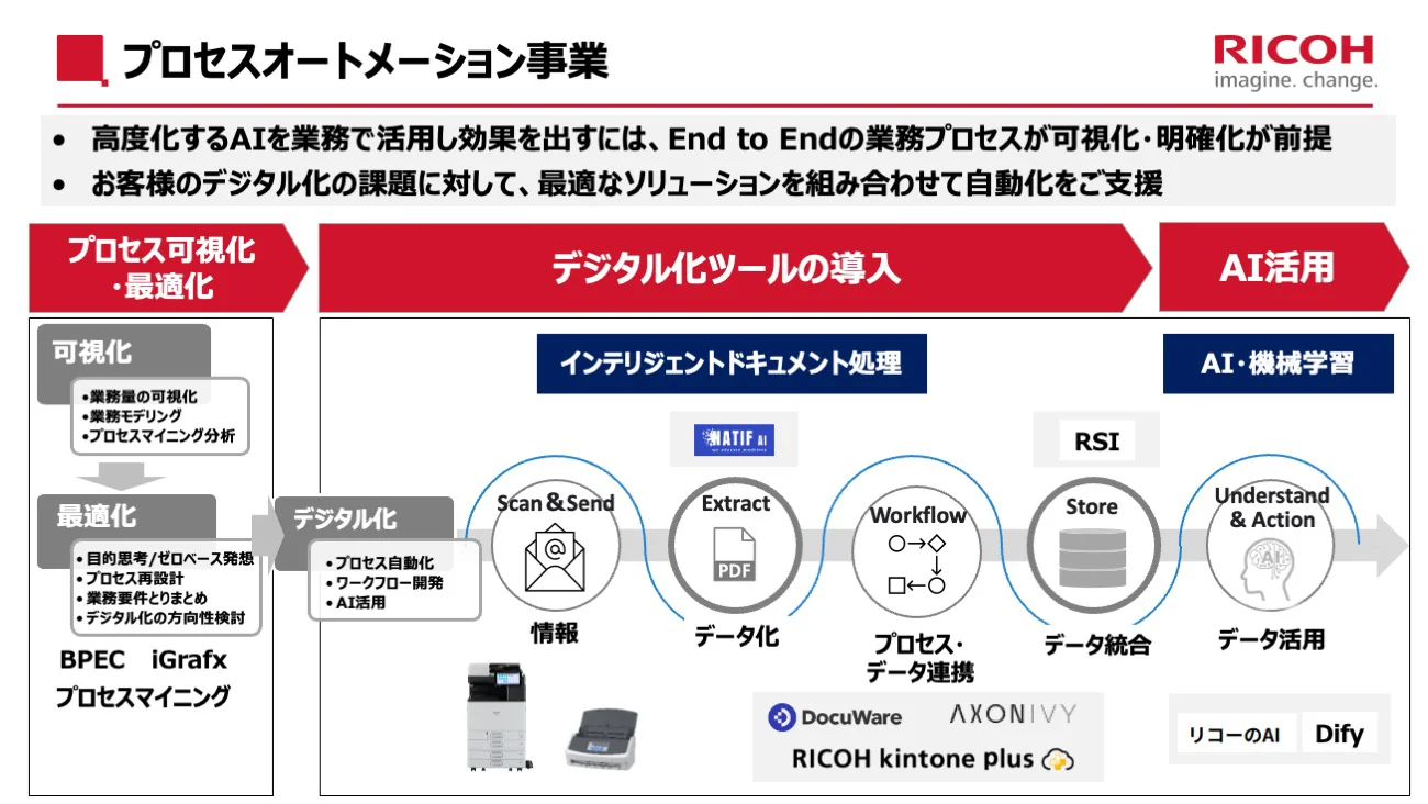 リコーはプロセスオートメーション事業の各ステップにおいて、次のようなソリューションを揃えていると、髙松氏。「文書のスキャンは複合機やPFUのスキャナー、インテリジェントドキュメント処理(IDP)はNatif.ai、そしてワークフローはDocuWare、AXON IVY、RICOH kintone plus、データ活用の部分では独自開発のAI技術。顧客のデジタル化の課題に最適なソリューションを組み合わせて自動化を支援できる」と話した。