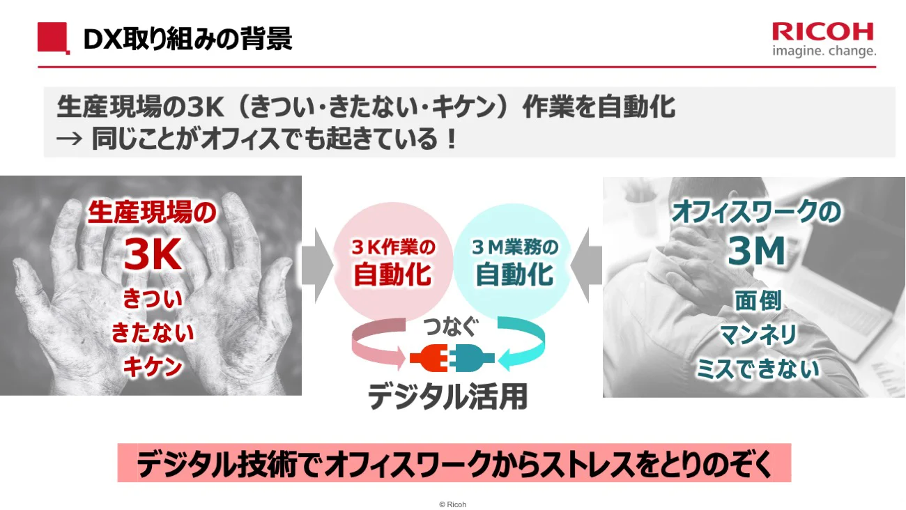 リコーのプロセスオートメーション事業の強みのひとつが、社内実践で得たノウハウの活用だ。リコーは2000年代から現場主導の業務プロセス改革に取り組み、2020年頃からは、組織横断的な業務プロセス改革活動「プロセスDX」として体系化。髙松氏はその背景をこう語る。「生産現場の3K(きつい・きたない・キケン)解消の取り組みが進む一方、オフィスに目を向けると、面倒・マンネリ・ミスできないという、ストレスを生む仕事の3Mが存在する。デジタル技術でこうしたオフィスワークのストレスを取り除くため、リコーは社内のプロセスDX活動を進めてきました」。