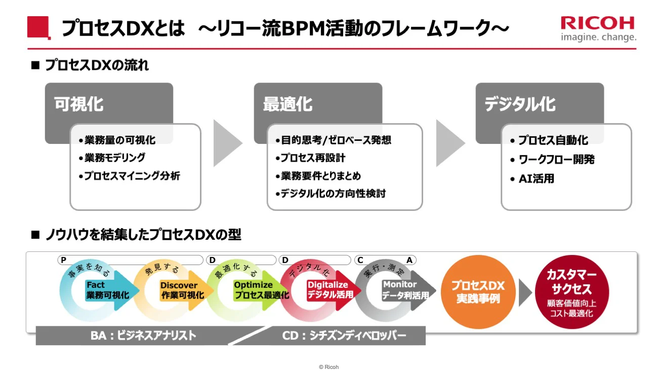 リコーのプロセスDX活動は、業務の「可視化」、プロセスの「最適化」、そして自動化やAI活用を含む「デジタル化」の3つで構成。全社員が業務改善に取り組んでおり、2025年3月時点で、RPAによって55万時間分の工数を削減する等の定量効果や、「次なる活動へのモチベーション」「より価値の高い業務へ従事できる」といった定性効果もあがっている。