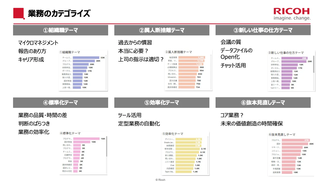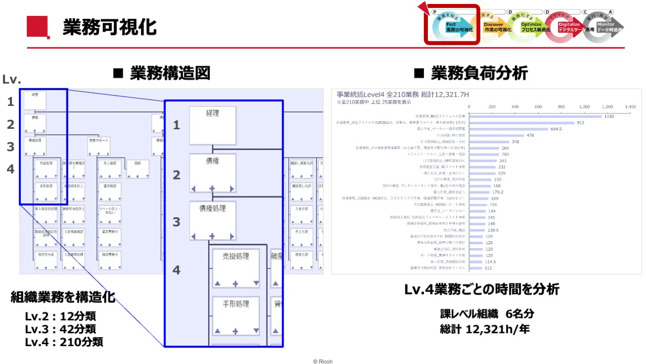 続いて髙松氏は、リコー社内の取り組みとして、自身が所属するリコーデジタルサービスビジネスユニットで実施する「業務可視化・削減ポテンシャル導出」の事例を紹介。ビジネスユニット内の115部署、930名では、平均20%の工数削減という高い目標を掲げた取り組みが進んでいる。