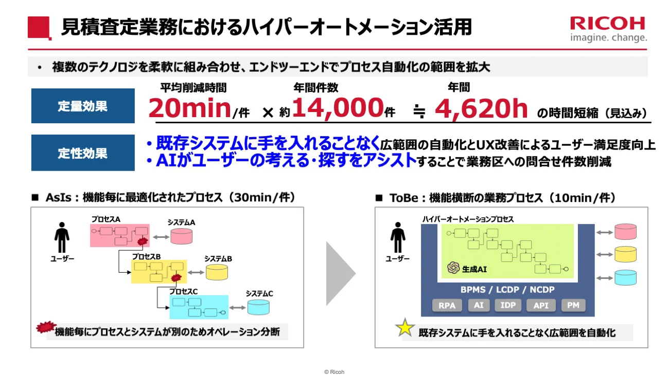 ふたつめの社内事例が「間接材購買業務の超自動化」だ。リコー社内で運用されている間接材購買システムの「見積査定」の入力作業は、別の予算システムや別ファイルで見積関連の多様なコードを検索して入力する必要があり、案件登録から申請までに10のステップが必要だった。そこで実施されたのが、AXON IVYによるプロセスオーケストレーションと、AIによるレコメンデーション機能の追加だ。