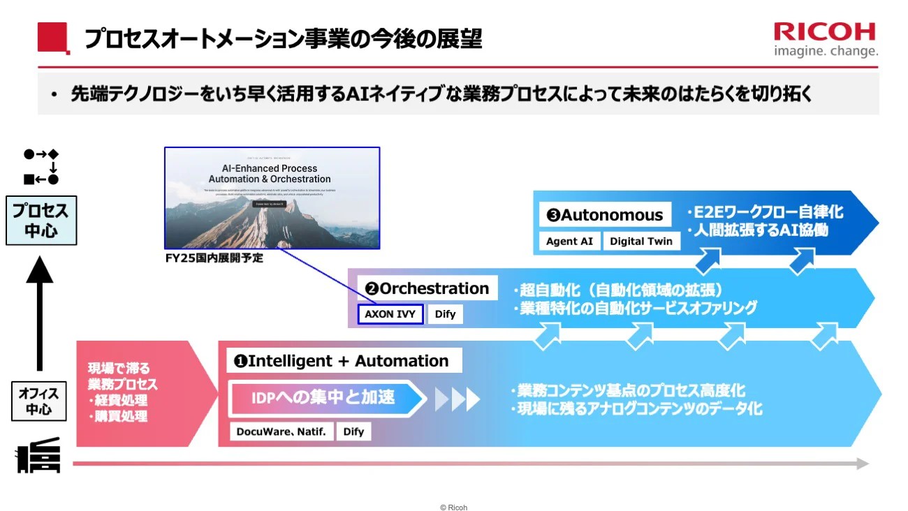 髙松氏は最後に、リコーのプロセスオートメーション事業の今後の展望として、ソリューションの3段階を説明。ひとつめは、IDPを活用して紙を含むアナログコンテンツをデータ化する「Intelligent + Automation」。第2段階の「Orchestration」では、AXON IVYやAIプラットフォーム・Difyを通じて、End to Endの業務プロセス最適化ソリューションを展開する。続く「Autonomous」においては、自律型AIや業務プロセスのデジタルツイン活用も含めた、より高度なソリューション提供につなげていく見込みだ。