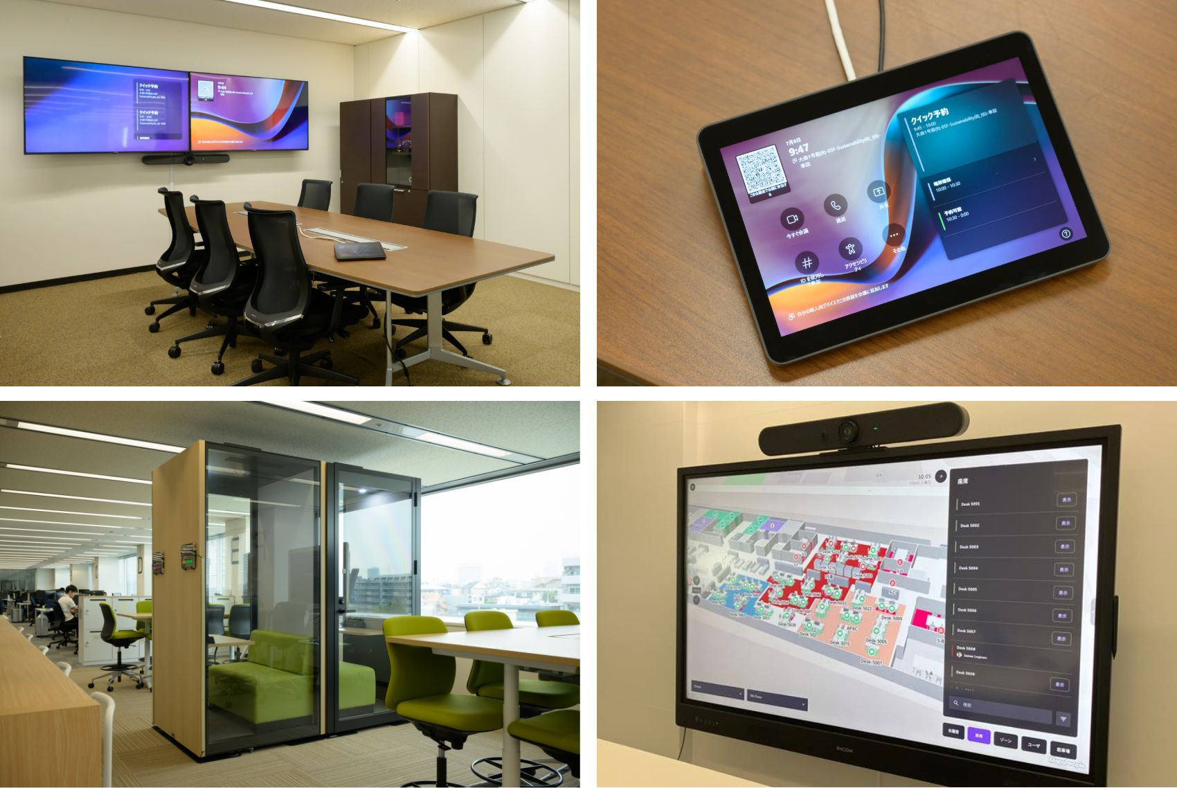 上段:会議室には新たにハイブリッド会議に適した設備を導入した。下段左:1人用の個室ブース「Web会議Box」。下段右:Ricoh SPACESの予約画面で会議室やフリーアドレス座席の使用状況が一覧できる