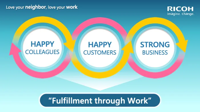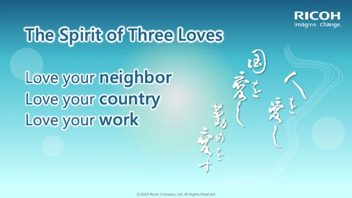 三愛精神のうちの「人を愛す」「勤めを愛す」は、リコーの社員に対するコミットメントと仕事に情熱を注げるような環境づくりへのコミットメントを表現したものです。AI技術の急速な進歩に伴い、今後、仕事の大半を人間に代わって機械が行う世界に私たちは生きています。しかし、社員を大切にし、社員中心の経営体制を維持することで、社員一人ひとりが、単に企業目標の達成に留まらず、全人類にとっての住みやすい未来の実現に対して貢献することができるのです。