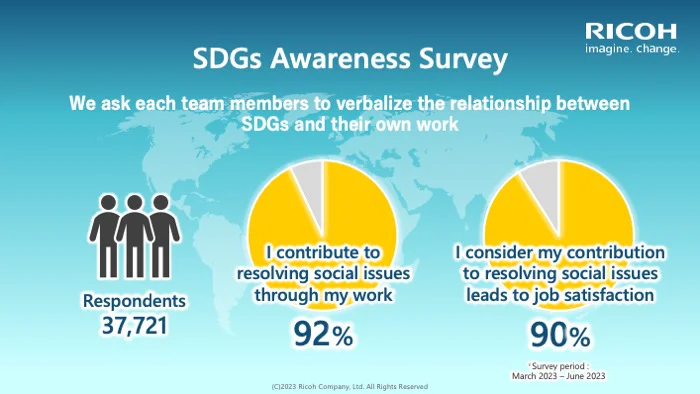 これはすべて、当社が掲げたビジョン「“はたらく”に歓びを」が実現されている証です。リコーで私たちが体験している変革は、私たちだけに限ったものではなく、誰もが取り入れられるものです。当社では、社員にSDGsと自分の仕事の関係をどのように感じているかの調査を行っています。その結果、全世界38,000人弱の回答者のうち、92%が自分の仕事は社会課題の解決に貢献していると感じており、そのことが仕事に対する満足につながっているとの回答もほぼ同数であることが分かりました。