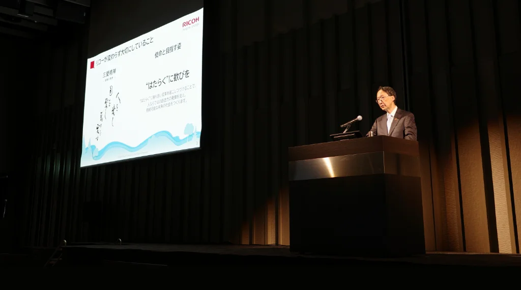 本講演では、リコーの使命と目指す姿「“はたらく”に歓びを」の実現に向けた、社員が目的意識を持ち、創造性を刺激されるような企業文化醸成の取り組みや社員が自分の役割とESG課題との関連性を見いだした結果生まれたイノベーションを紹介。またリコーの創業の精神である三愛精神「人を愛し 国を愛し 勤めを愛す」がいかに今日に至るまでリコーのサステナビリティの根底にあるかをお話ししました。