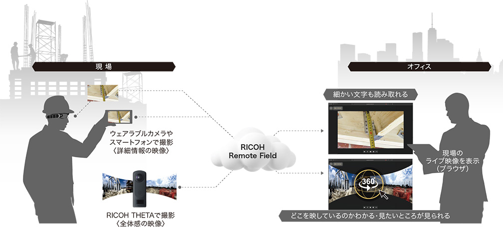 安藤ハザマの現場では、遠隔での現場パトロールのほか、遠隔地での検査等で「RICOH Remote Field」を活用していきます。具体的には、三脚を取り付けた「RICOH THETA(360度カメラ)」を設置した場所や、ウェアラブルカメラを装着した作業員が撮影している現場の映像を「RICOH Remote Field」を使い、リアルタイムに配信します。ウェアラブルカメラにはマイク・スピーカーもついており、撮影者は操作不要で遠隔側とコミュニケーションを取りながら映像配信ができます。