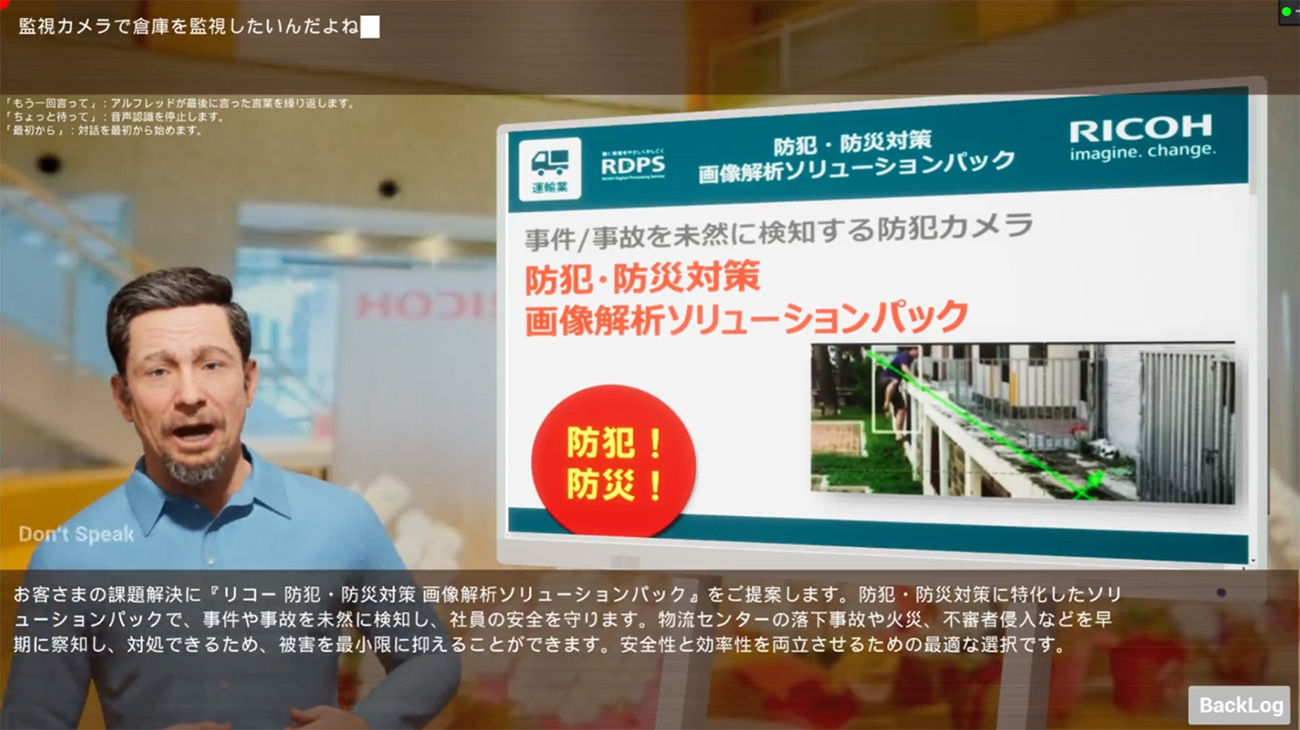 リコーの開発する音声認識AIは、マイクから離れたノイズや残響を含む音声、人同士のくだけた話し言葉も高い精度で認識することができる独自の技術を有しており、正確さが求められるビジネスの現場での活用に適しています。また、この特徴はリコーが開発中のAIエージェントにも活かされています。リコーのAIエージェントは、音声会話の内容をAIが素早く認識・解析し、動的に次の質問を生成して対話を重ねていくことで、会話の中でお客様のニーズを捉え、的確な提案を行います。さらに、リコーはこのような音声認識AIと他のAI技術とを組み合わせ、お客様の働く場所での会話・音声データの利活用を支援し、新たな価値に変え、お客様の経営課題解決につながるデジタルサービスをご提供します。