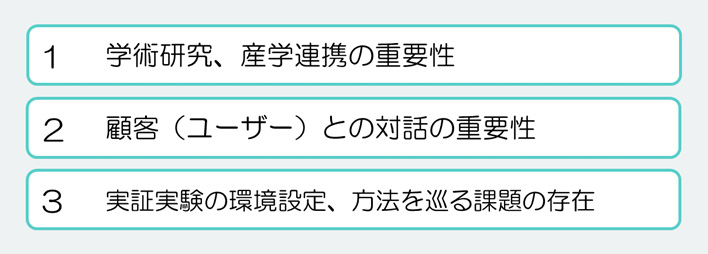 その上で、コンソーシアム参加企業は、自らの取り組みやサービスの有効性をどのように検証しているのか具体的な取り組みから解決策を探ってきました。本レポートでは、各企業の取り組み事例を紹介しています。同コンソーシアムでは、プログレスレポートVol.1公表以降、計13回に及ぶ会合などにおいて、参加企業それぞれが抱える課題やその解決に向けた試行錯誤や工夫の様子を議論してきました。そうした互いの経験から得られた気づきと教訓は、「学術研究、産学連携の重要性」、「顧客(ユーザー)との対話の必要性」、「実証実験の環境設定、方法を巡る課題の存在」の3つです。