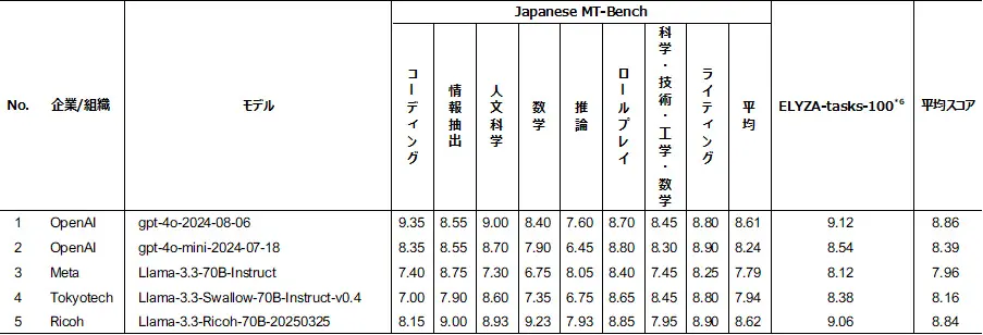 株式会社リコー(社長執行役員:大山 晃)は、米Meta Platforms社が提供する「Llama-3.3-70B-Instruct」の日本語性能を向上させた「Llama-3.3-Swallow-70B-v0.4*1」をベースモデルに、同社のInstructモデルから抽出したChat Vector*2と、リコー製のChat Vector*3を独自のノウハウでマージすることで、リコーが開発・提供する700億パラメータの日本語大規模言語モデル(LLM*4)の性能を向上させました。ベンチマークツールによる検証の結果、米OpenAIが開発したGPT-4oと同等レベルの優れた性能が確認されました(2025年3月25日時点)。高性能でありながら、省コスト・省リソースを実現し、オンプレミス環境でお客様情報の追加学習が可能なプライベートLLMとして、企業内での導入を支援します。