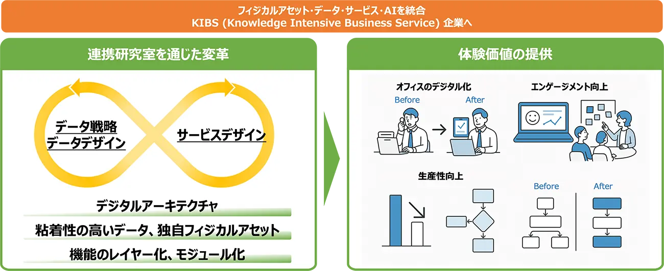 今回、新設した連携研究室では、各機関が保有する知見を統合し、サービス工学を基盤に、知的生産性を最大化するための方法論・技術の研究開発を加速します。本研究室を拠点として、知識集約型産業における高付加価値な成果を生み出すためのソリューションの開発と社会実装を進めます。
