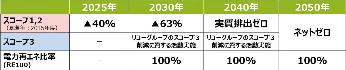 国際的に脱炭素化社会の実現に向けた活動が進み、国内においても政府や企業の関心が益々高まってきています。リコーグループは2030、2040、2050年に対しスコープ1,2,3及び再生可能エネルギーの脱炭素目標を設定しています。このたびリコージャパンとしての2030年以降の脱炭素目標を設定しました。